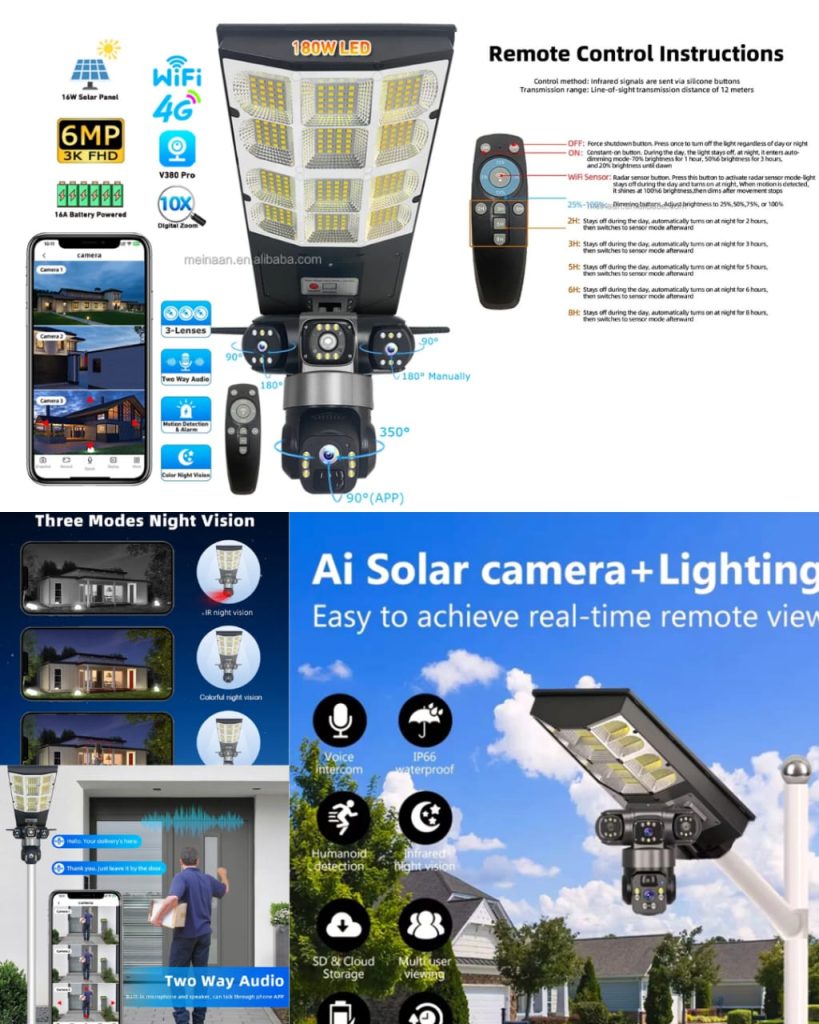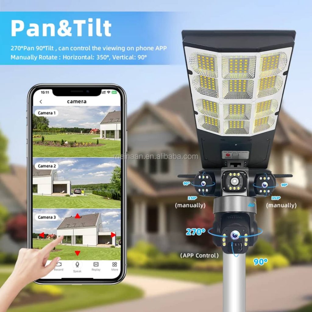 Powerful illumination, advanced surveillance, and eco-friendly design with this state-of-the-art Solar Street Light with Three-Lens Camera and remote control. Designed for modern security needs, this system combines high-performance LED street lighting with an intelligent three-lens HD camera, ensuring your environment stays brightly lit, well-monitored, and fully protected โ all without relying on electricity.